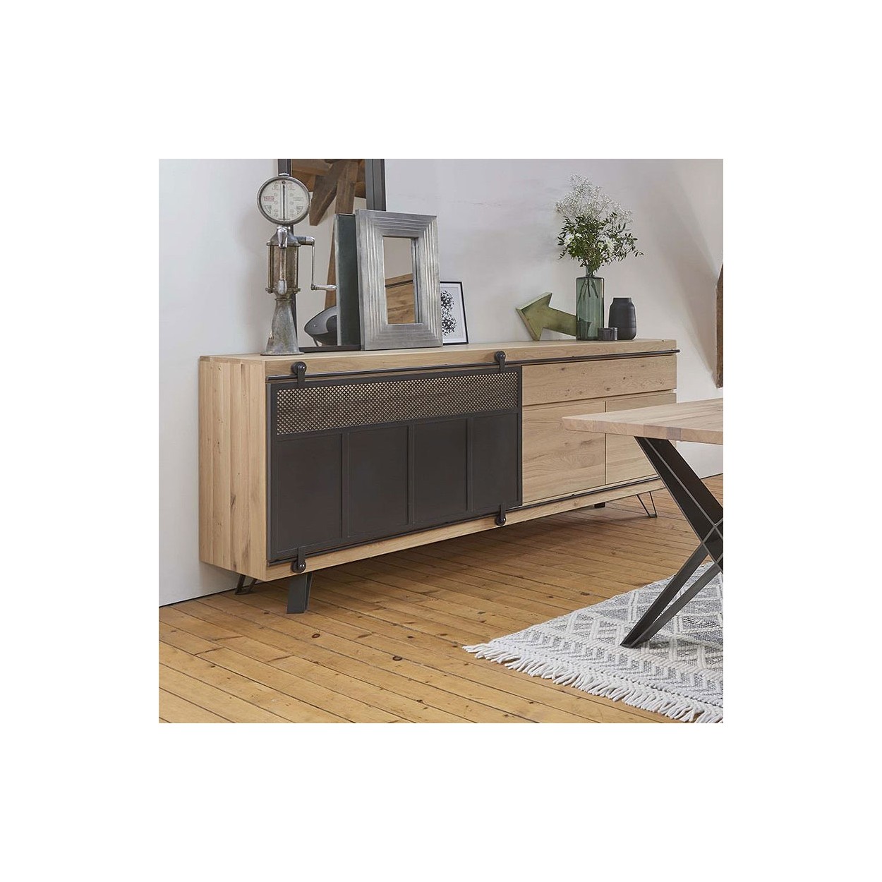 La collection Fusion est en chêne massif (façade, côtés, plateau, portes, tiroirs) et placage chêne ( étagères, fond, séparation). Finition chêne clair avec nœuds naturellement présents . Porte en métal coulissante avec roulettes en acier sur tube métallique.