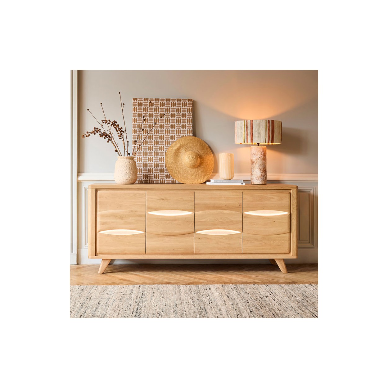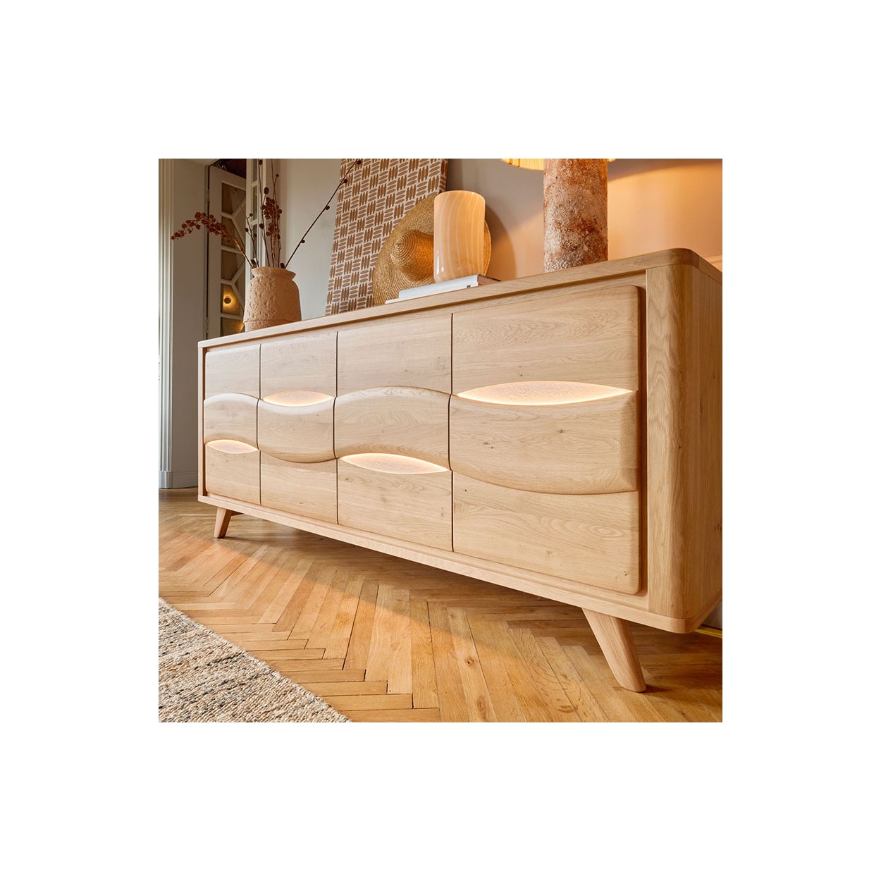 Notre collection Olonne présente un design moderne avec des formes ondulées sculptées et des éclairages intégrés subtils en façade, elle est en finition bois clair donnant de la luminosité. Il repose sur des pieds inclinés, créant élégance et chaleur naturelle dans votre intérieur.
