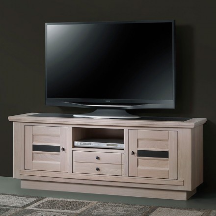 La collection Belem est en chêne massif blanchi. Portes assemblées par profil et contre-profil. Fermeture par serrure (sauf porte centrale), incrustation céramique en traverse centrale. Tiroirs assemblées à queues en quatre angles sur glissière à billes.