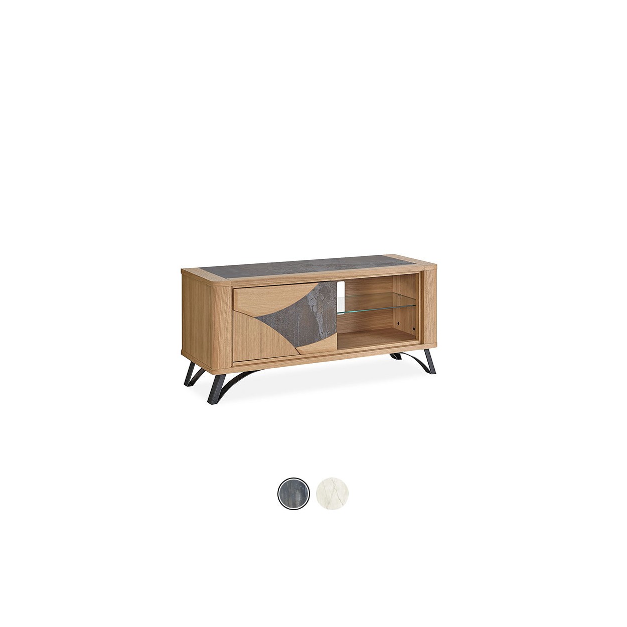 La collection Riviera est en panneaux de fibres plaqués chêne massif finition brossée avec incrustation en céramique brun panaché ou beige. Portes battantes amorties, ouverture système 'push' avec incrustations en céramique. Piétement métal finition époxy.