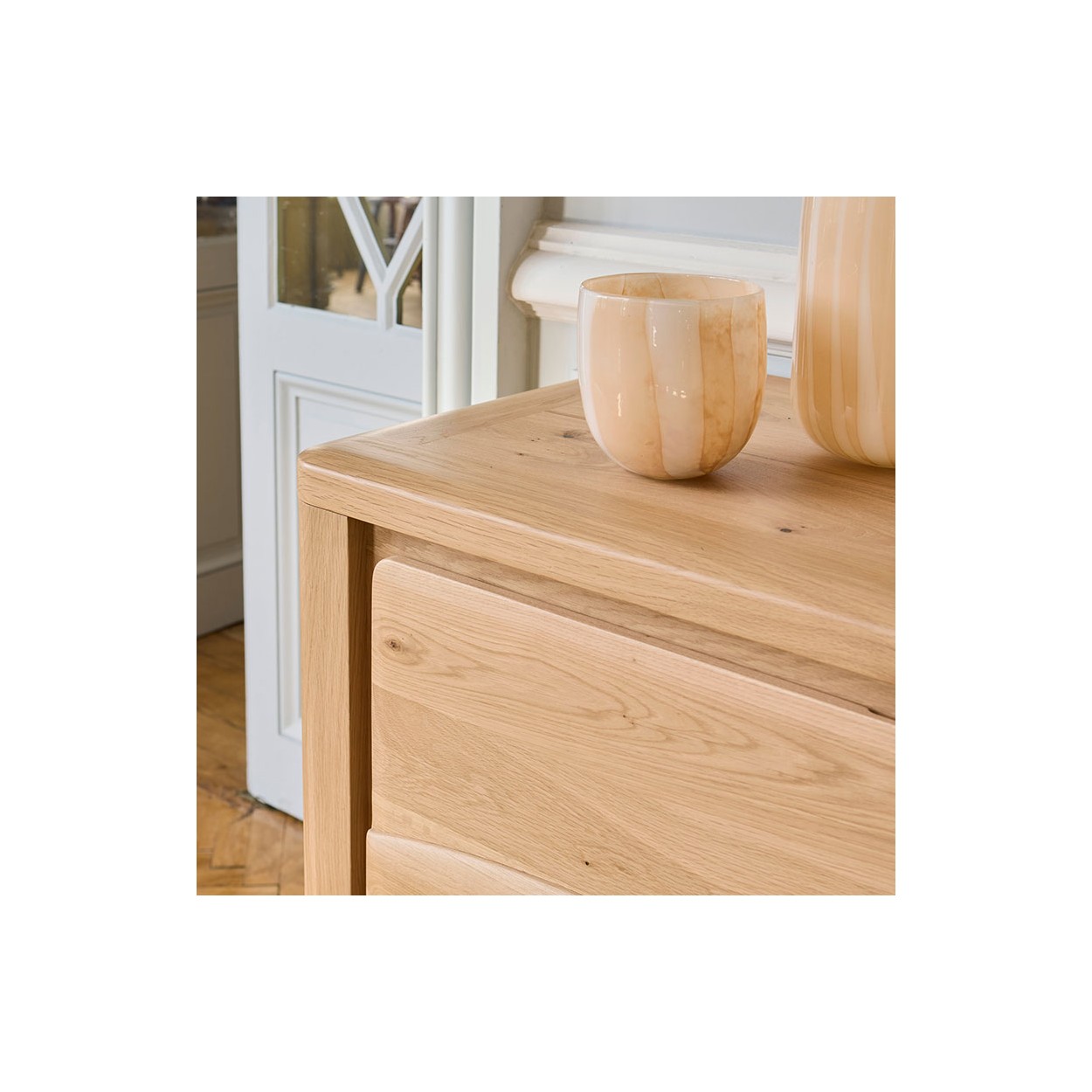 La collection Olonne est en chêne massif (encadrement, façade) et placage chêne (étagères, fond, séparation). Finition chêne clair avec nœuds naturellement présents. Portes avec fermeture amortie. Piétement en chêne massif teinté.