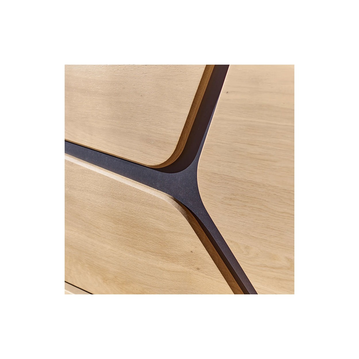 La collection Néo est en chêne massif qualité rustique avec recharge en chêne massif pour avoir une épaisseur visuelle de 26mm. fond en chêne abouté ou autre bois massif. Séparations en chêne massif abouté. Piétement en contreplaqué de bouleau laqués noir mat.