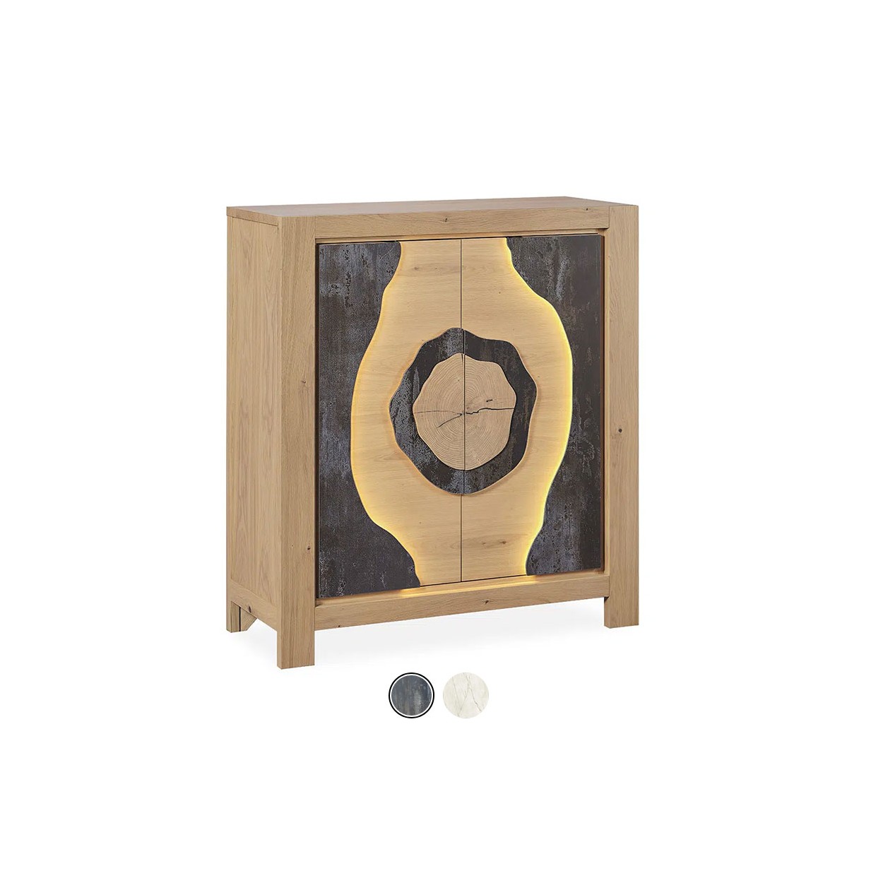 Cette collection contemporaine MINÉRALE associe bois massif et panneaux céramiques aux tons minéraux, sublimé par un éclairage LED qui souligne ses courbes organiques et son motif naturel central. Elle donne élégance, il offre un espace de rangement généreux tout en devenant une pièce maîtresse de votre intérieur. Un équilibre parfait entre design moderne et chaleur naturelle.