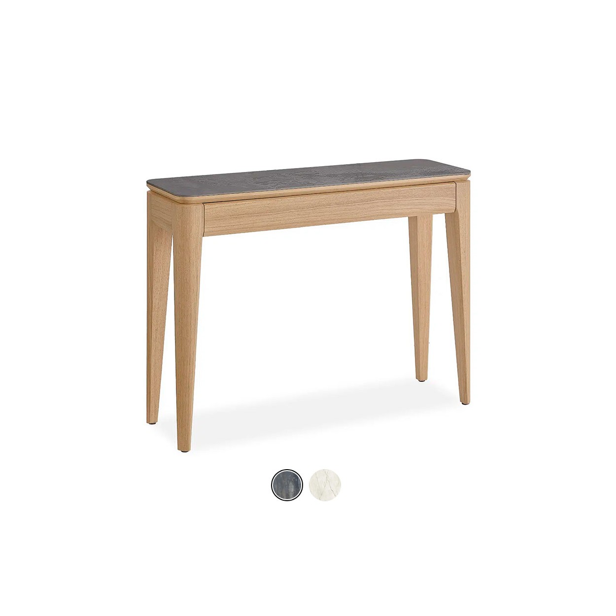 La collection Minérale est en panneaux de fibres plaqués chêne massif finition brossée avec incrustation en céramique veinée grise ou beige. Portes battantes amorties avec incrustations en céramique. Tablettes intérieures réglables.