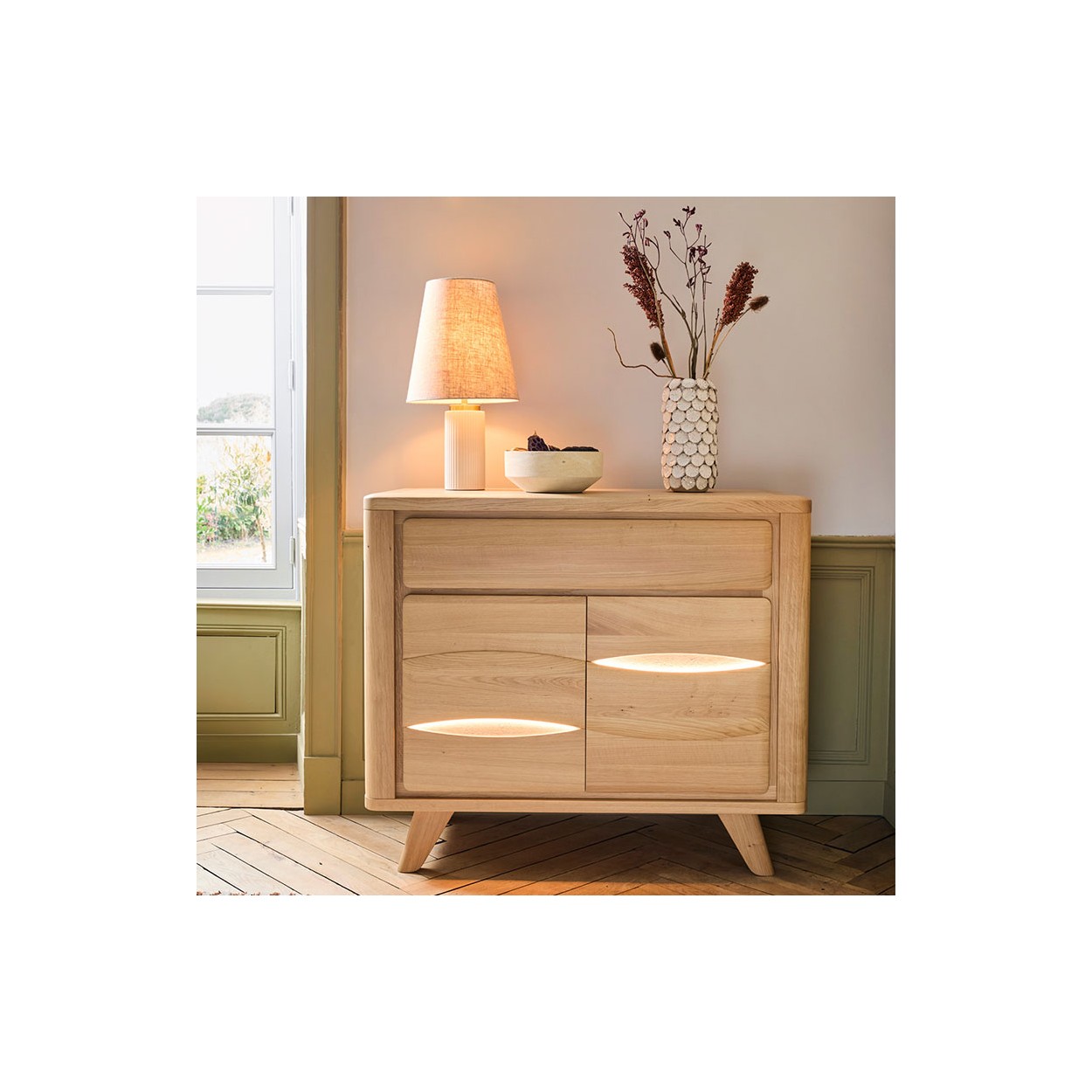 La collection Olonne est en chêne massif (encadrement, façade) et placage chêne (étagères, fond, séparation). Finition chêne clair avec nœuds naturellement présents. Portes avec fermeture amortie. Piétement en chêne massif teinté.