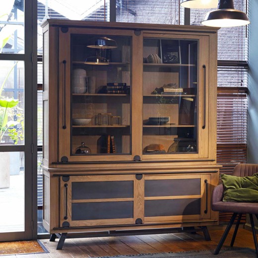 La gamme Passerelle est en chêne massif et placage chêne. Portes battantes en panneaux placage chêne revêtus de plaques métalliques. Tiroirs traditionnels en chêne massif sur coulisses avec amortisseurs fin de course. Portes coulissantes en chêne massif. Piétement métallique. Finition métal gris Eiffel. Finition chêne vintage. Quincaillerie décorative en métal patiné.