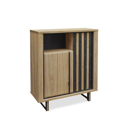 La collection Dune est en panneaux de fibres plaqués chêne massif finition brossée, plateau avec incrustation en céramique veinée grise. Portes battantes avec incrustations céramique. Tiroir avec séparations intérieures. Tablettes intérieures réglables. Piétement métal anthracite avec incrustation de chêne massif.