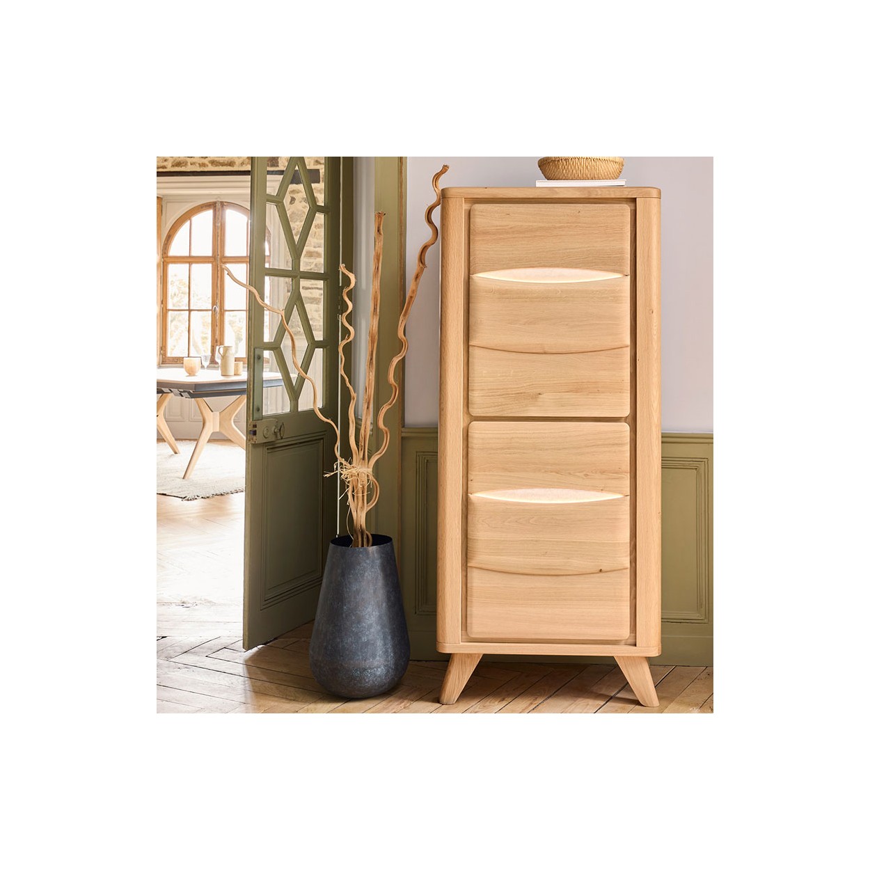 La collection Olonne est en chêne massif (encadrement, façade) et placage chêne (étagères, fond, séparation). Finition chêne clair avec nœuds naturellement présents. Portes avec fermeture amortie. Piétement en chêne massif teinté.