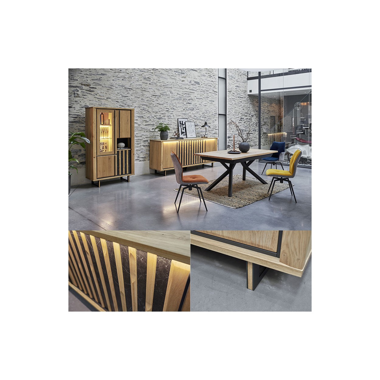 La collection Dune est en panneaux de fibres plaqués chêne massif finition brossée, plateau avec incrustation en céramique veinée grise. Portes battantes avec incrustations céramique. Tiroir avec séparations intérieures. Tablettes intérieures réglables. Piétement métal anthracite avec incrustation de chêne massif.