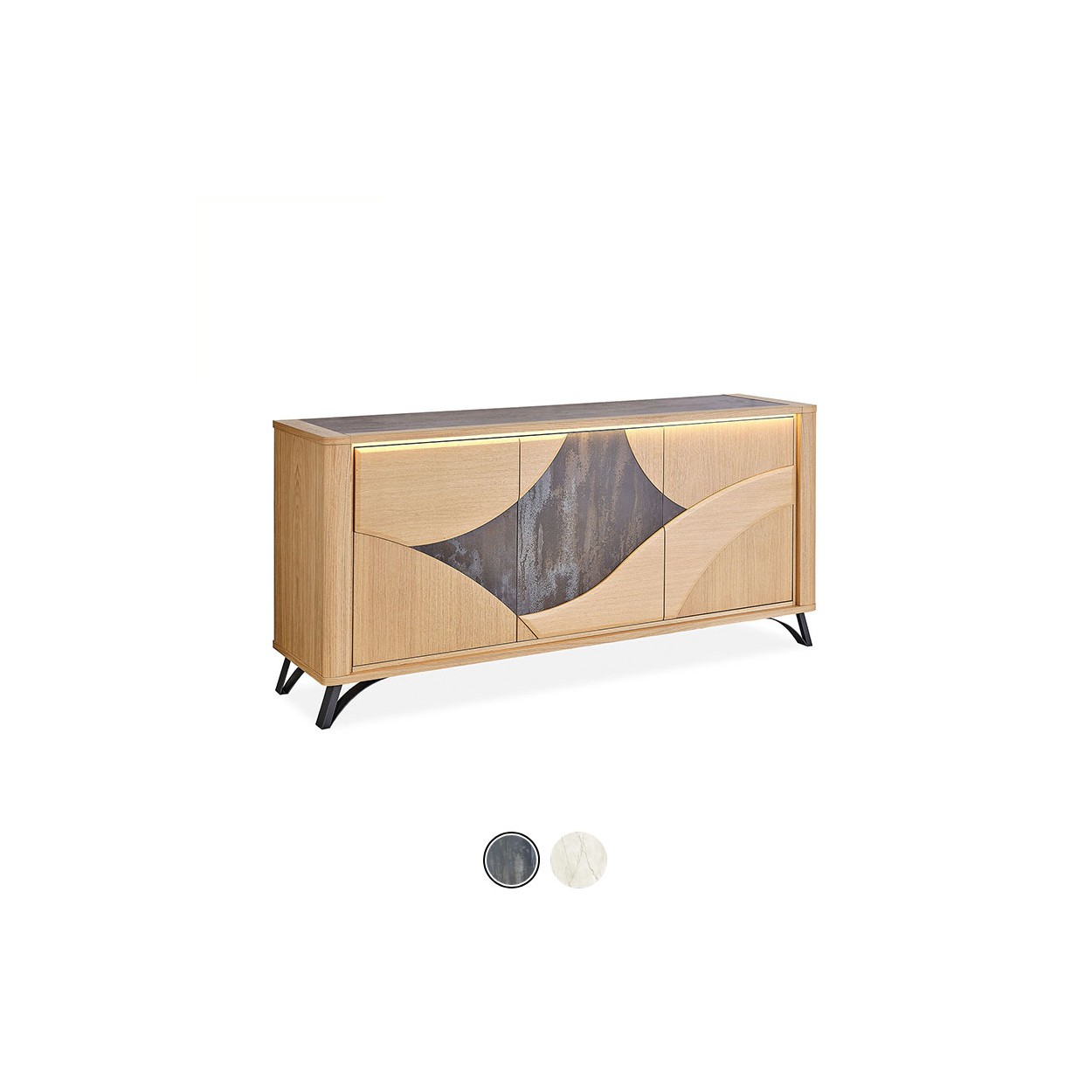 La collection Riviera est en panneaux de fibres plaqués chêne massif finition brossée avec incrustation en céramique brun panaché ou beige. Portes battantes amorties, ouverture système 'push' avec incrustations en céramique. Piétement métal finition epoxy
