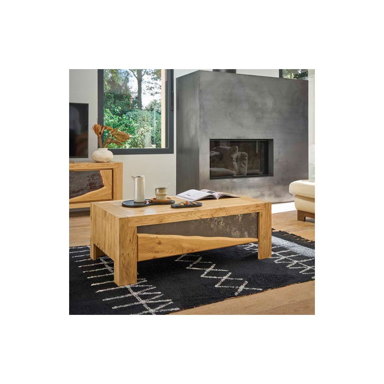 La collection présente des nuances et aspects naturels du bois tels que des nœuds et toutes les caractéristiques du bois authentique. Ces aspects naturels donnés par le chêne mettent en valeur ce meuble et sa finition.