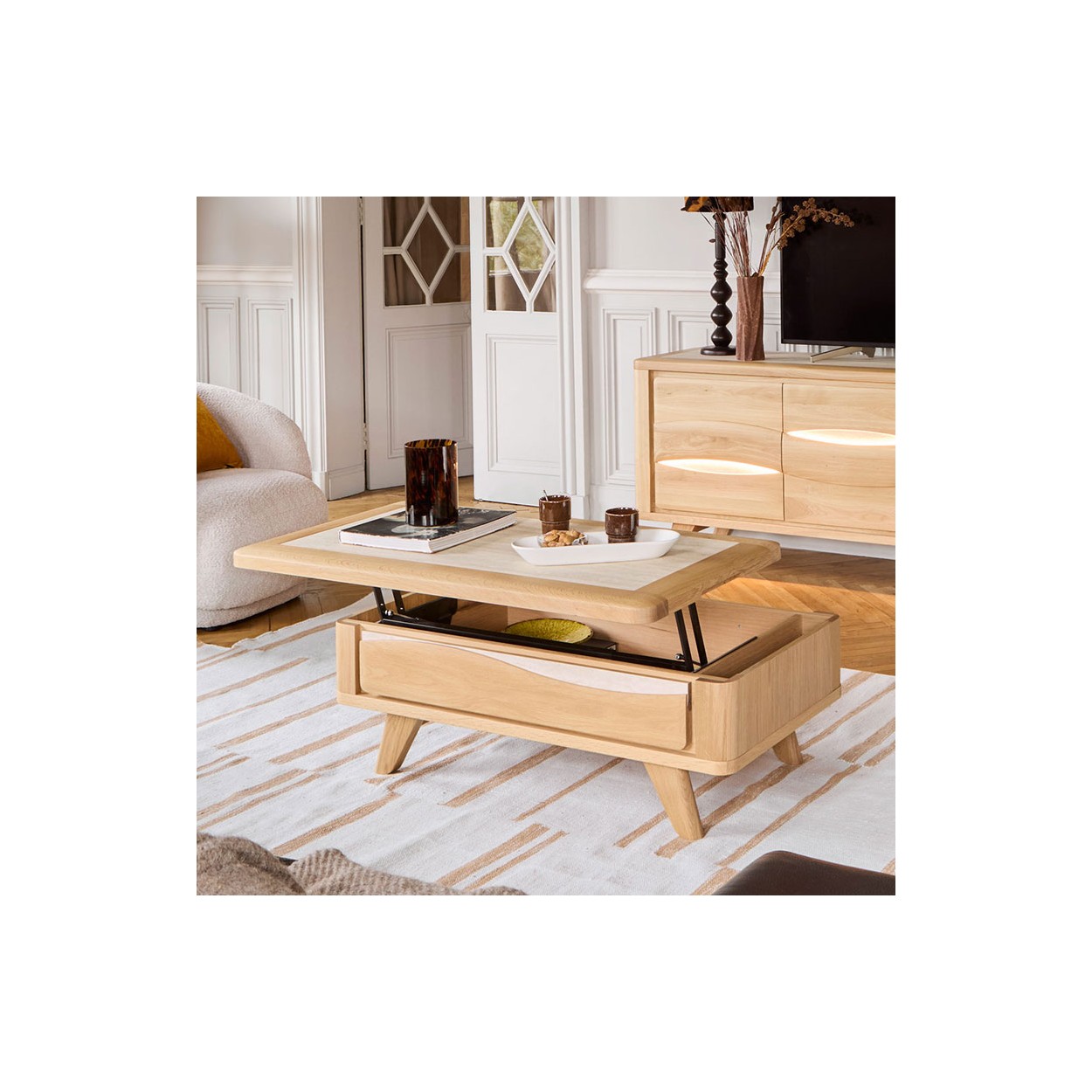 La collection Olonne est en chêne massif (encadrement, façade) et placage chêne (étagères, fond, séparation). Finition chêne clair avec nœuds naturellement présents. Portes avec fermeture amortie. Piétement en chêne massif teinté.