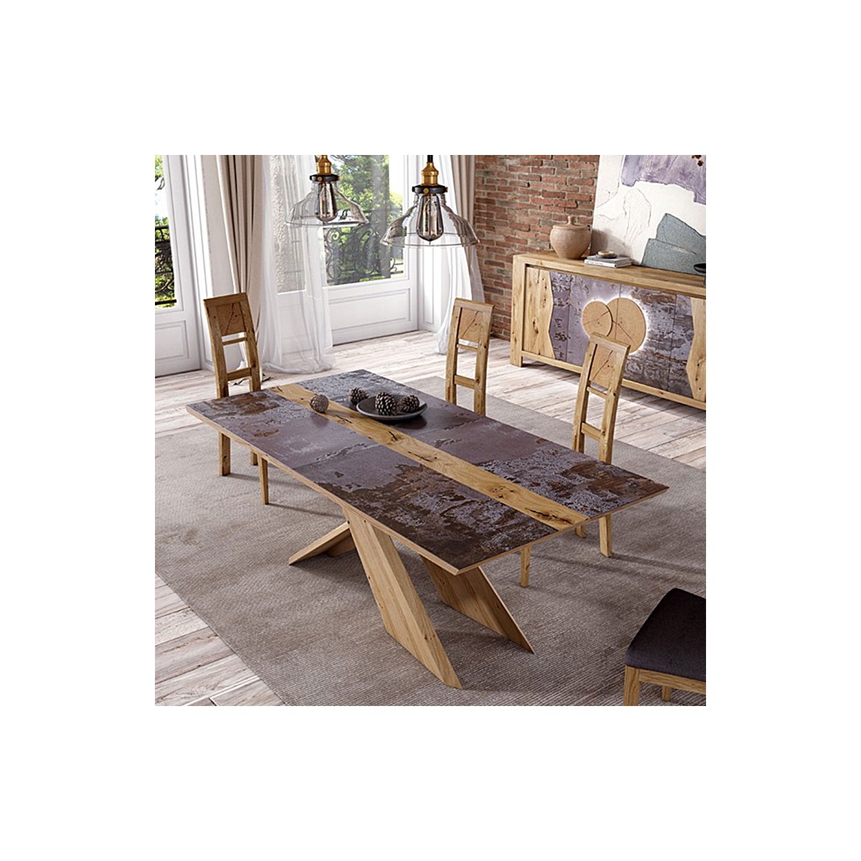 La collection Floirac est en placage chêne sauvage, côté en frêne massif avec incrustation en façade d'élément en céramique ou Dekton. Teintes et vernis sans biocides conforme à la règlementation.