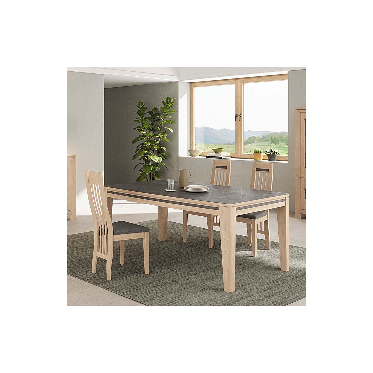 La collection Milos est en chêne massif (montants, socle, façade portes et tiroirs) et placage chêne véritable. Vernis chêne naturel, plateau et façade avec incrustation céramique. Encadrement de table et piétement en chêne massif ou placage selon version.