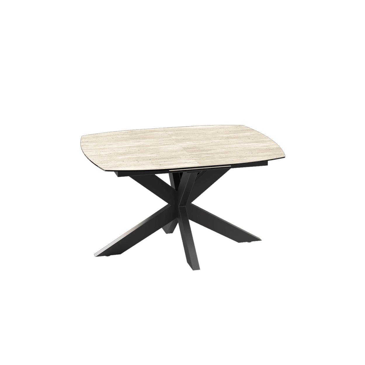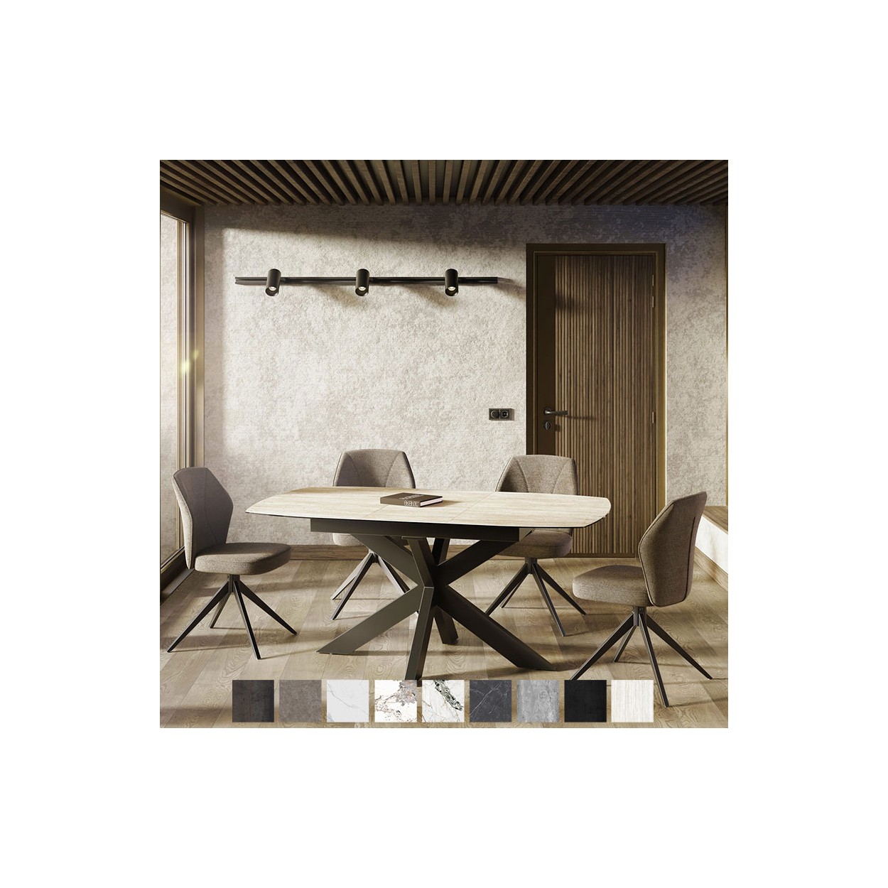 La table Phoenix possède un plateau en véritable céramique imitation marbre avec un piétement métal. Système extensible avec ouverture centrale automatique.